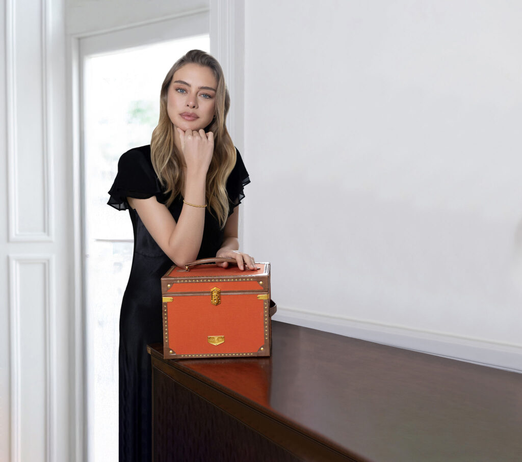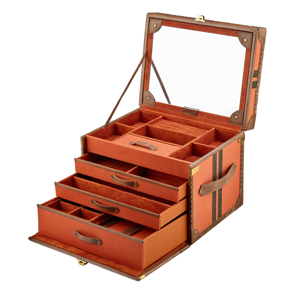 Este año, la colección crece con la incorporación del nuevo joyero estilo baúl (trunk) en tono naranja, que se suma al ya icónico color kaki, así como dos refinadas versiones de estuches de viaje para joyería, disponibles en ambas tonalidades. Cada pieza está elaborada con exterior de lona fabricado a partir de materiales reciclados, en tonos lujosos, acentuados con detalles de tachuelas de latón y acabados en cuero, inspirados en el baúl de viaje de Ida.
