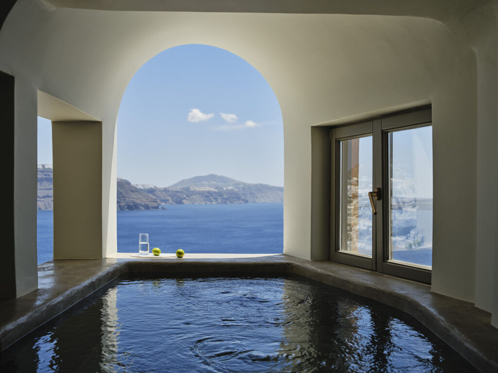 Cada alojamiento cuenta con amplias terrazas privadas, ideales para tomar el sol, disfrutar de un cóctel o contemplar los espectaculares atardeceres. Algunas incluyen piscinas de inmersión o jacuzzis infinity con vistas ininterrumpidas al mar, un diseño que busca que los espacios interiores y exteriores se integren de manera fluida, como una galería abierta al paisaje volcánico de Santorini.