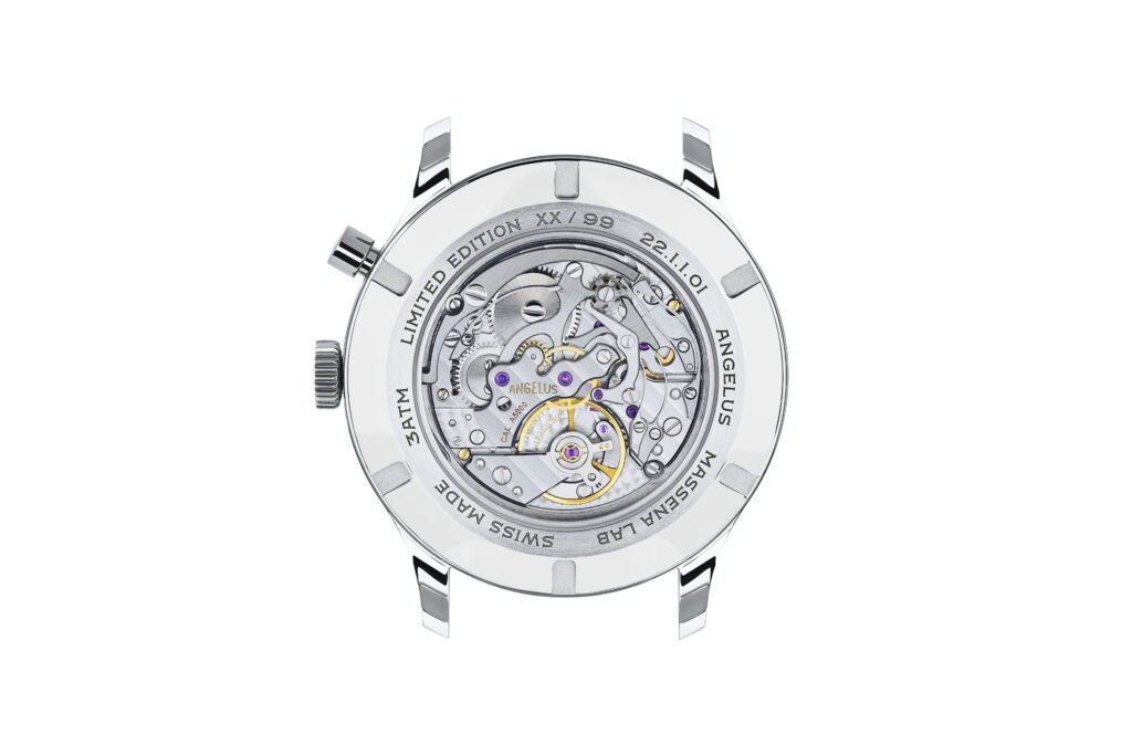 Angelus retoma hoy esa innovación con un diseño fiel al espíritu de la época, pero actualizado para el coleccionista contemporáneo. La nueva edición, Chronographe Médical x Massena LAB, incorpora el calibre A5000, un movimiento de cuerda manual desarrollado por Angelus y caja de acero inoxidable 316L quirúrgico de 39 mm de diámetro, una evolución respecto al modelo original que mejora la legibilidad de sus escalas.