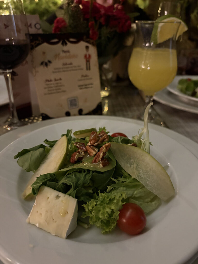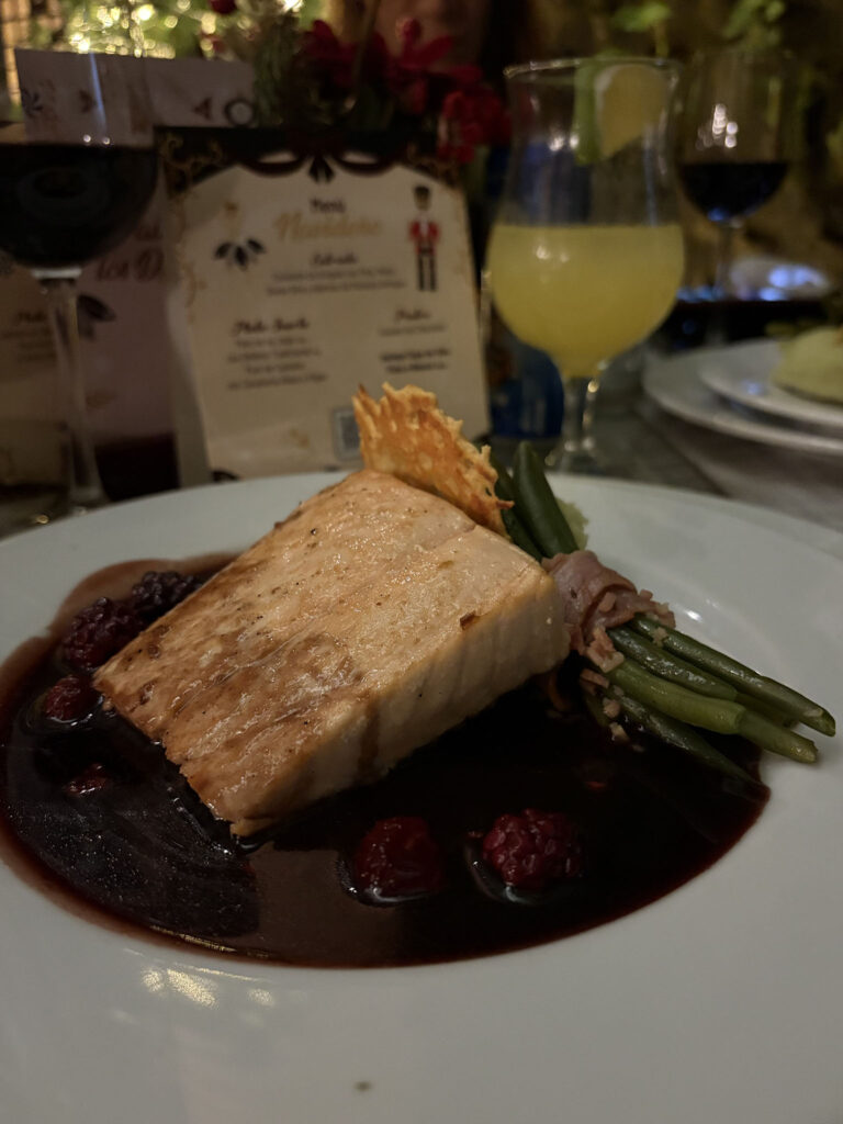 Para despedir el 2025, el menú de Fin de Año abre con una crema de espárragos con queso parmesano y continúa con un salmón en salsa Cumberland, acompañado de puré de espárragos y ejotes envueltos en tocino. El postre es un festivo rollo navideño de fresa con coulis de moras. El precio es de $1,450, también con copa de vino incluida.