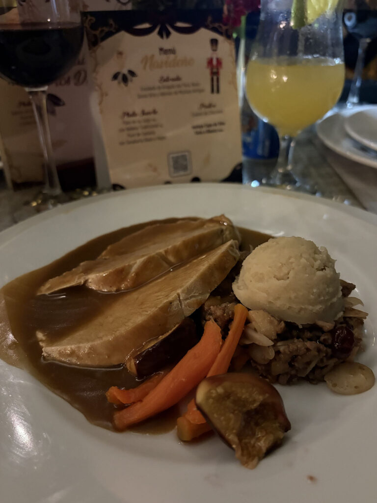 Para la noche del 24 de diciembre, el hotel presenta un menú navideño que inicia con una fresca ensalada de arúgula con pera, nuez y queso brie, bañada en un aderezo de mostaza. El plato fuerte es un pavo en su jugo con relleno tradicional, servido con puré de castaña, zanahoria glaseada e higos. Y para cerrar con un toque dulce, un coulant de chocolate. Este menú tiene un costo de $1,340 e incluye una copa de vino tinto o blanco.