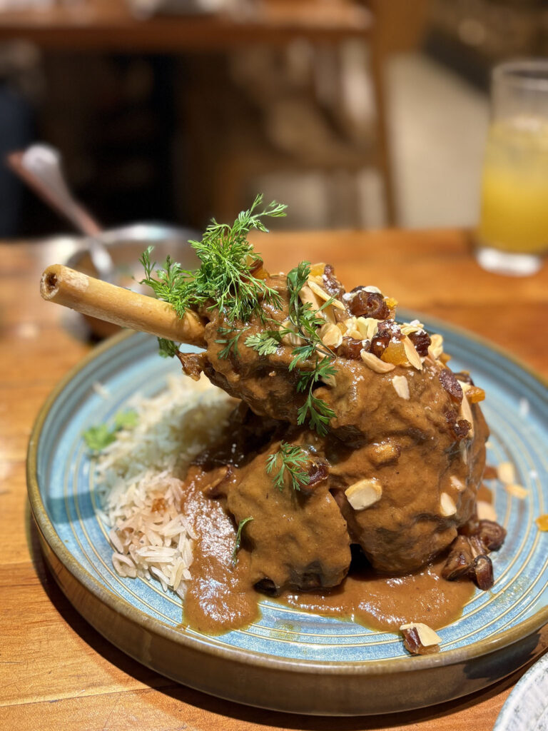 Como plato principal, el chamorro de cordero fue el protagonista indiscutible. Servido sobre arroz persa a la mantequilla, con salsa de dátil y chabacano, frutos secos y cilantrillo, se deshace en la boca. El contraste entre lo dulce, lo especiado y lo graso es tan interesante como memorable.