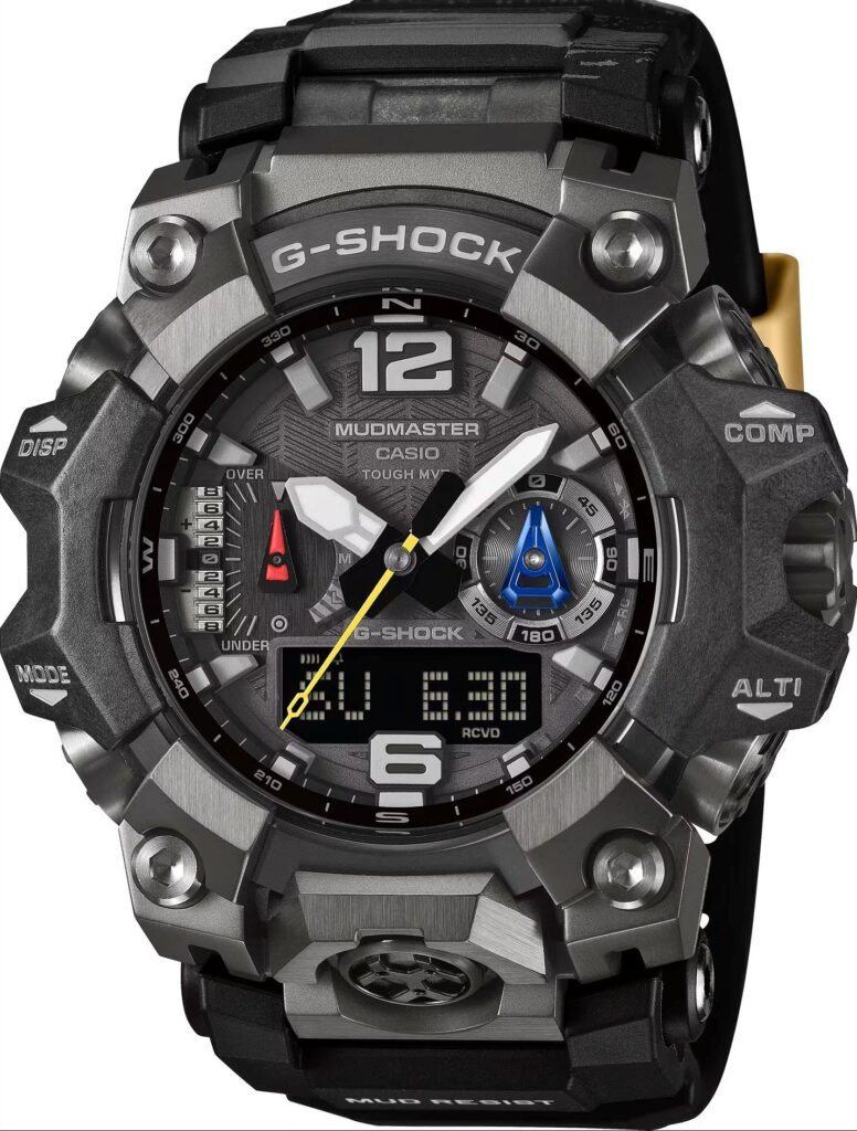 El MUDMASTER GWG-B1000TLC-1A incorpora elementos que remiten directamente a la experiencia del desierto, como una correa texturizada, tonos metálicos oscuros, manecillas con acentos multicolor y un dial inspirado en sistemas de navegación utilizados en el rally, además de una carcasa reforzada con fibra de carbono para máxima resistencia.